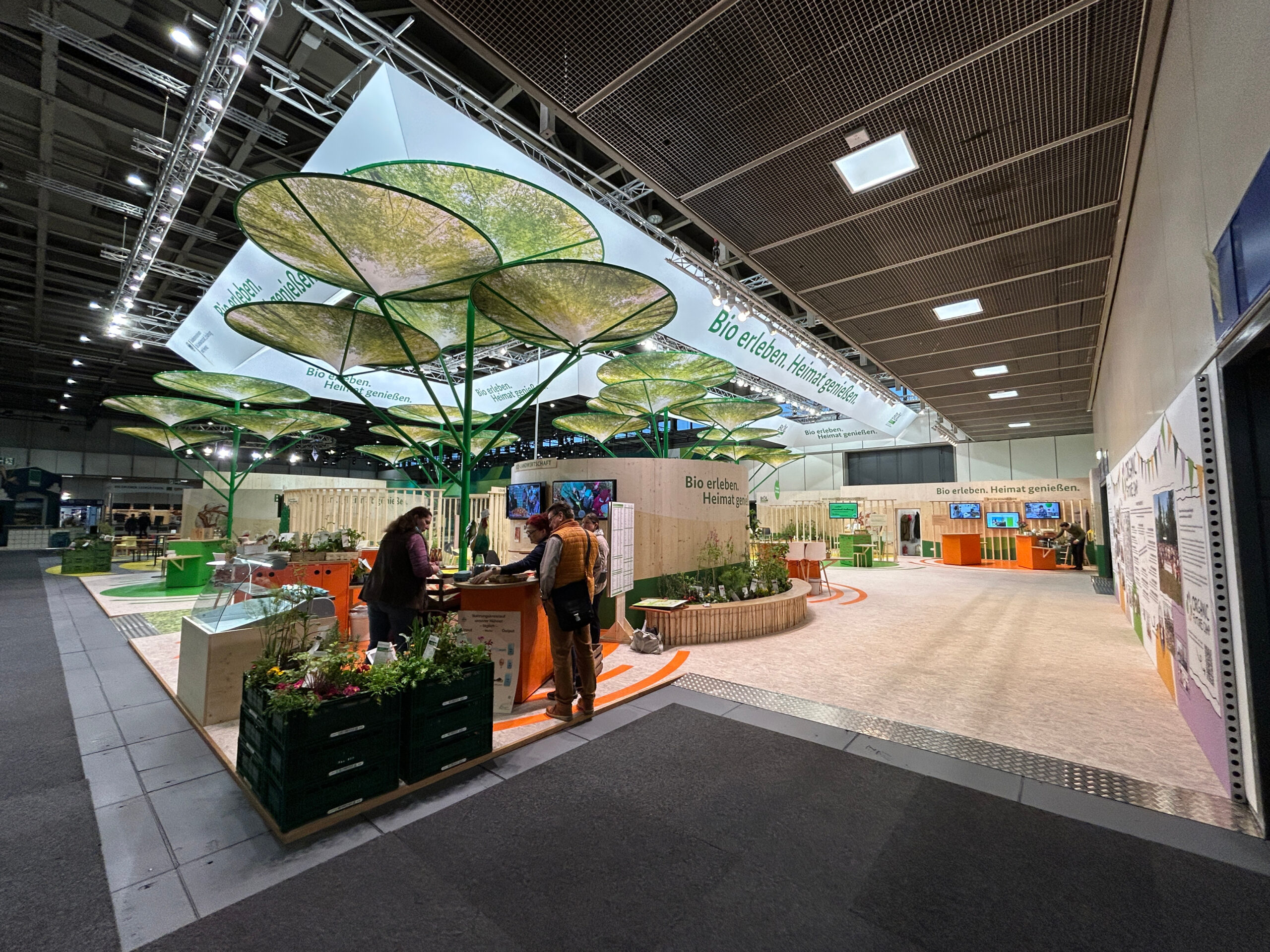 Seit mehr als 15 Jahren organisieren wir den BÖL-Messeauftritt auf der Grünen Woche – von der ersten Idee bis zum letzten Applaus. Wir übernehmen das Projektmanagement und die Gesamtsteuerung – inklusive der Planung, Koordination und Abstimmung aller beteiligten Partner: Architektur, Standbau, Technik, Lieferanten, Mitaussteller, Köchinnen und Köche, Moderation u. v. m. Zu unseren Aufgaben zählen außerdem: das Bühnenmanagement, die Einsatzplanung für das gesamte Personal, die VIP- und Standbetreuung sowie die begleitende Kommunikation inklusive z. B. Pressearbeit und Social Media Management. Außerdem sind wir für die komplette Hallen-Koordination in der Bio-Halle verantwortlich.