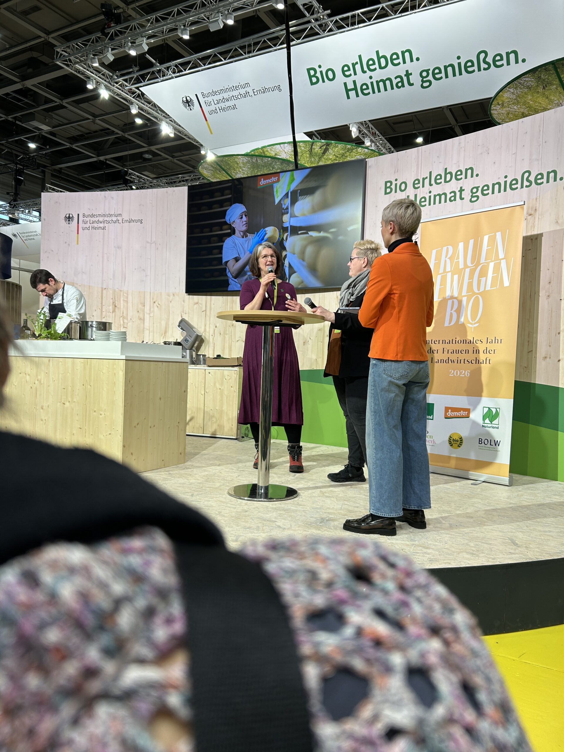 präsentiert sich jedes Jahr mit großem Messestand und attraktivem Bühnenprogramm in der Bio-Halle der Grünen Woche in Berlin. Der BÖL-Messeauftritt ist dabei das kommunikative Zentrum der Bio-Halle. Und das mit bestem „Biotainment“: mit großem Messestand, attraktivem Bühnenprogramm, tollen Kochshows, lehrreichen Mini-Workshops, leckeren Probierportionen, Diskussion und Austausch mit Bio-Bäuerinnen und -Bauern, mit Forschungsteams, Akteuren aus Bio-Städten und Bio-Wertschöpfungsketten. Das Ziel: Anlaufstelle für alle Bio-Akteure und -Interessierte auf der Messe zu sein, zudem BÖL-Projekte praxisnah vorzustellen und so den gesamten Weg der Bio-Lebensmittel vom Acker bis auf den Teller erlebbar und nahbar machen.