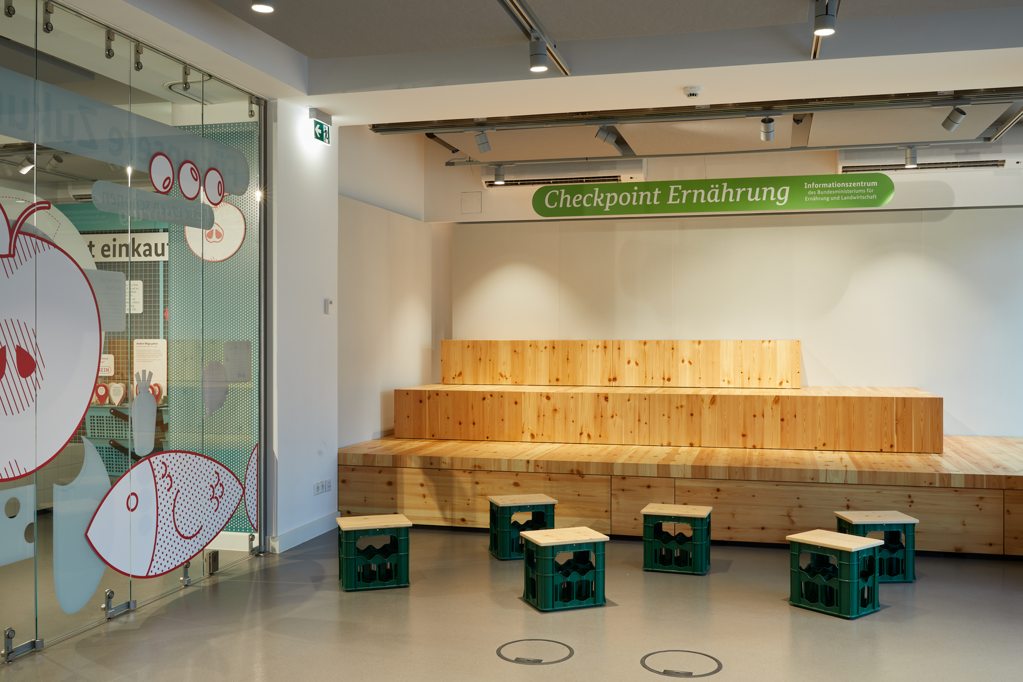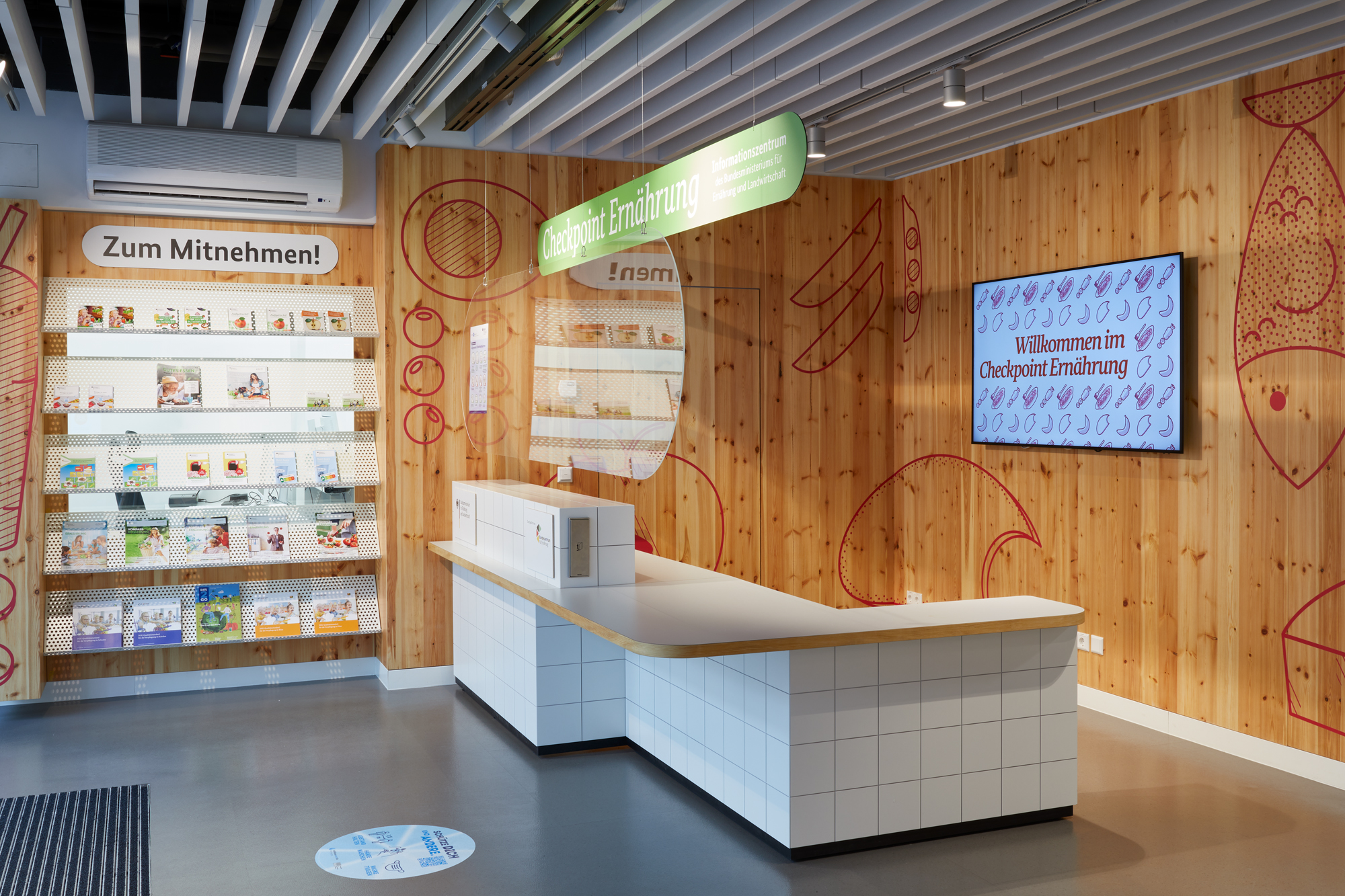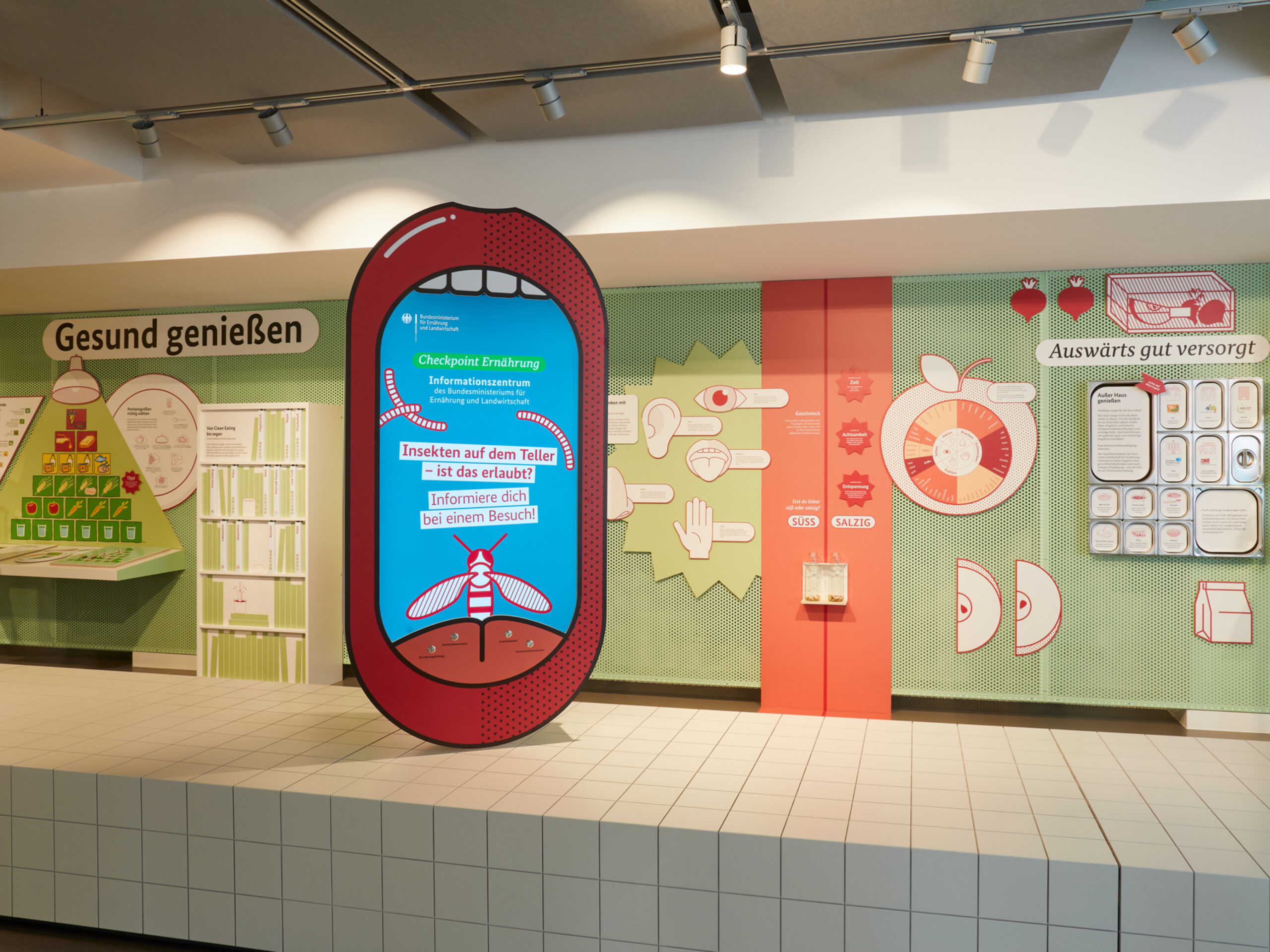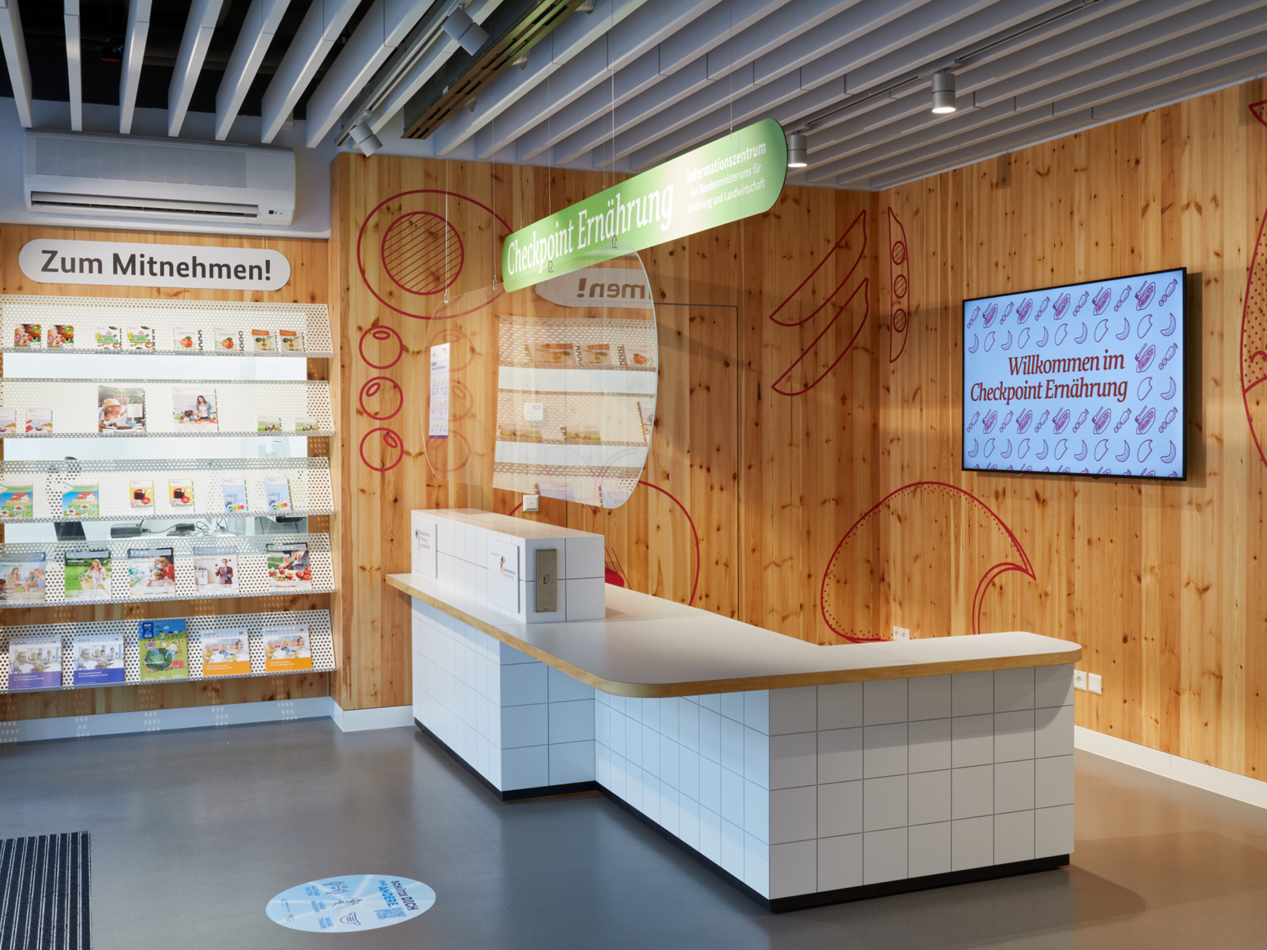 Erzeugen, einkaufen, lagern, zubereiten, genießen: Der „Checkpoint Ernährung“ war das Informationszentrum rund um’s Essen – mitten in der Berliner Friedrichstraße. Die interaktive Ausstellung lud mit anschaulichen Grafiken und vielfältigen Exponaten zu einer Entdeckungstour durch Einkaufskörbe, Kochtöpfe und Lieblingsspeisen ein. Die einzelnen Stationen regten spielerisch dazu an, das eigene Essverhalten zu reflektieren und vermittelten praxisnahe Tipps für eine nachhaltige, gesundheitsförderliche und zugleich genussvolle Ernährung. Zielgruppen waren Schulklassen, Wahlkreisgruppen sowie interessierte Bürgerinnen und Bürger. Auftraggeber war das damalige Bundesministerium für Ernährung und Landwirtschaft.
